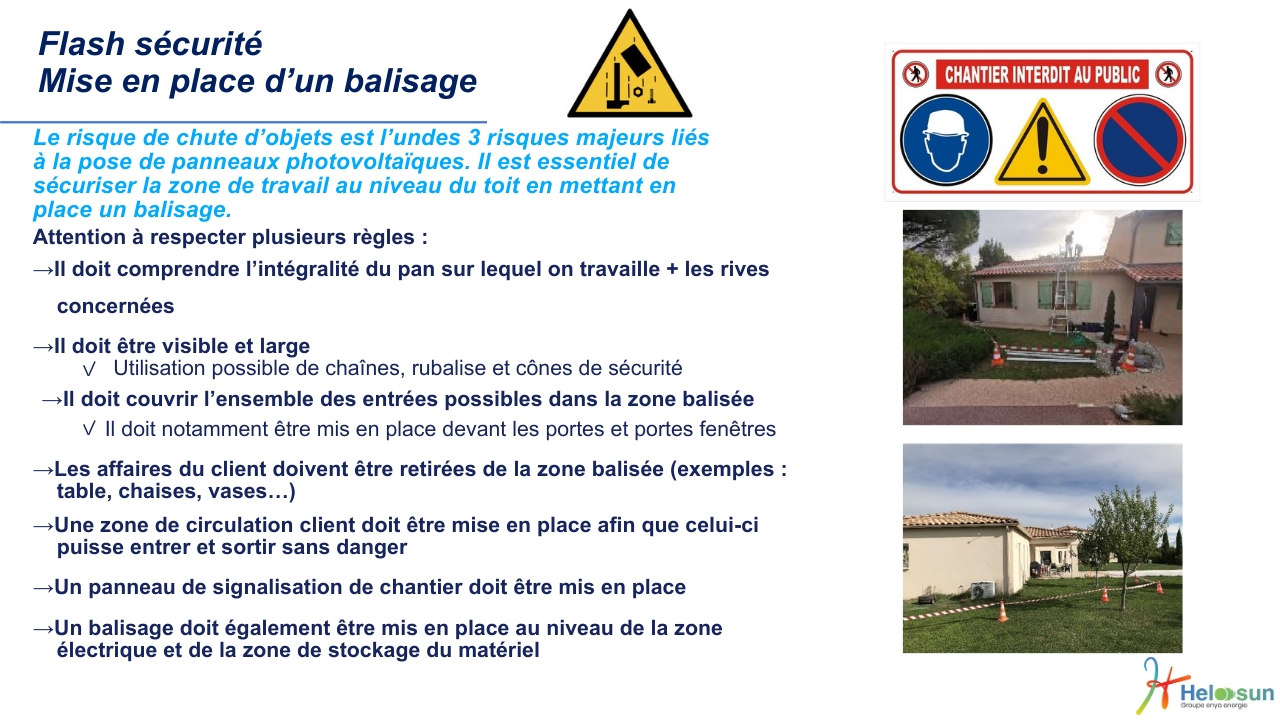 La maîtrise des risques et l'appropriation de la politique QHSE passent par une formation régulière et une sensibilisation de tous les acteurs. HelooSun s'engage à mettre en œuvre les moyens nécessaires pour que chaque collaborateur et partenaire dispose des connaissances et des réflexes adaptés à son métier et à son environnement de travail.